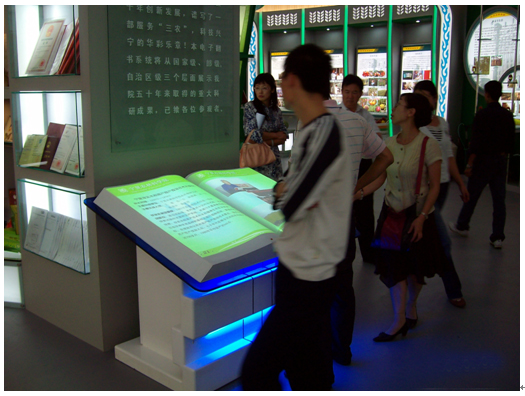 虛擬翻書又稱電子翻書、空中翻書,它是在展廳的一個桌面上放置的一本翻開的虛擬圖書,當(dāng)觀眾伸手做出翻書的動作時,這本虛擬圖書就會真的可以翻頁,讓觀眾瀏覽書的內(nèi)容,在展示栩栩如生的動態(tài)翻頁效果時并伴有音效。觀眾在驚嘆神奇的虛擬技術(shù)的同時,也會對圖書的內(nèi)容產(chǎn)生興趣。
