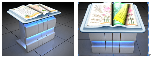 •觀眾站在書模型前做翻書動作時,翻書感應(yīng)器檢測出揮手的方向,計算機(jī)立即控制圖書翻頁,既可以向前翻,也可以后翻;